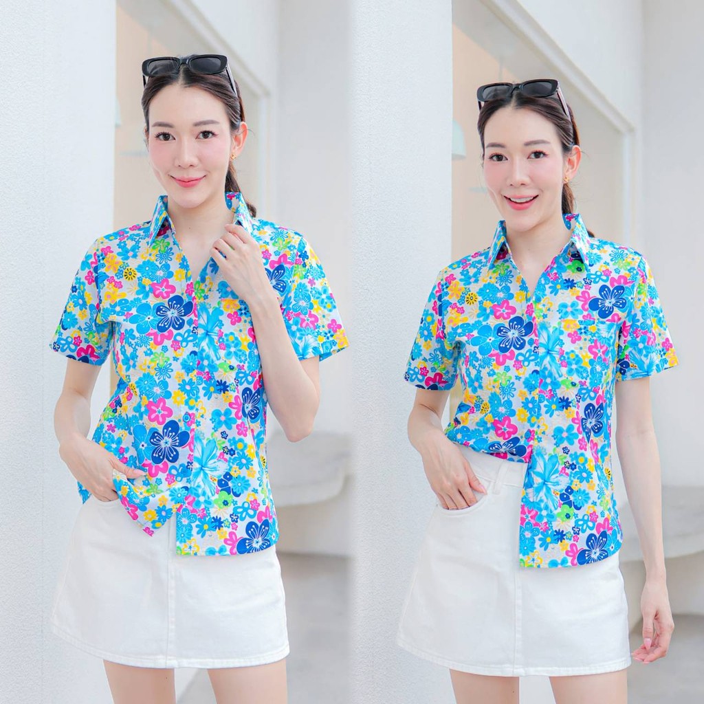 PINKรวมเสื้อเชิ้ตลายดอก2025 เสื้อสงกรานต์ลายดอก ผ้าคอตตอน100% สีไม่ตก ผ้าไม่หด